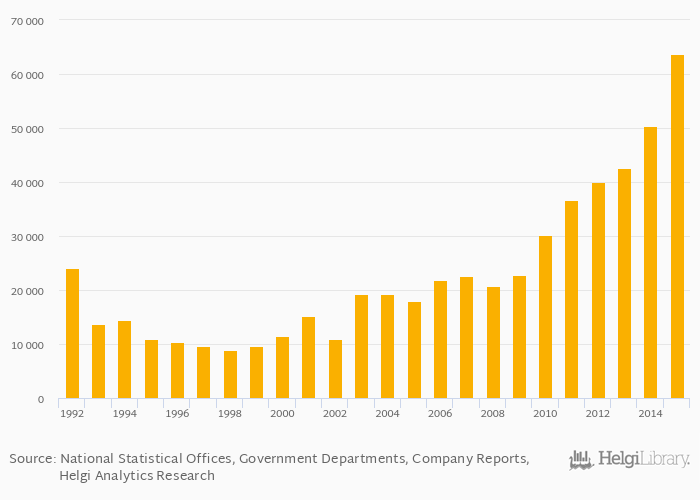 Historically, gold (mine) production in Kazakhstan reached an all time high of 63,614 kg in 2015 and an all time low of 8,929 kg in 1998. When compared to Kazakhstan's main peers, gold (mine) production in China amounted to 450,053 kg, 17,600 kg in Kyrgyzstan, 255,783 kg in Russia and 102,000 kg in Uzbekistan in 2015.