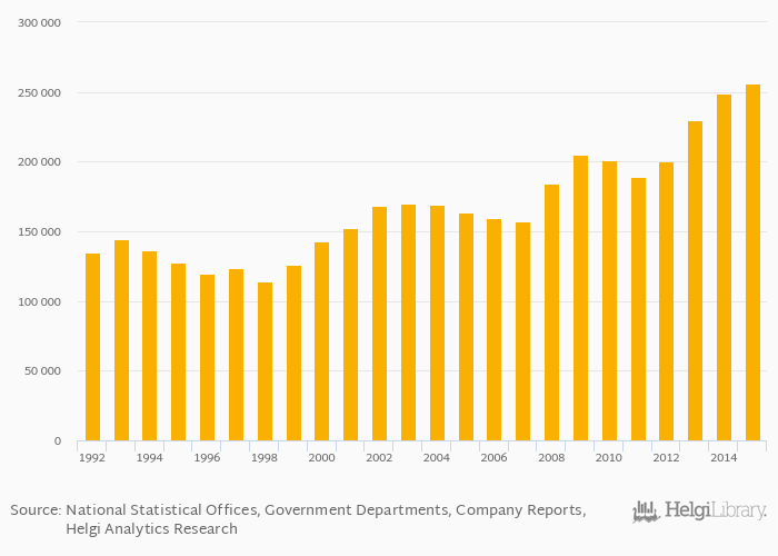 Historically, gold (mine) production in Russia reached an all time high of 255,783 kg in 2015 and an all time low of 113,807 kg in 1998.