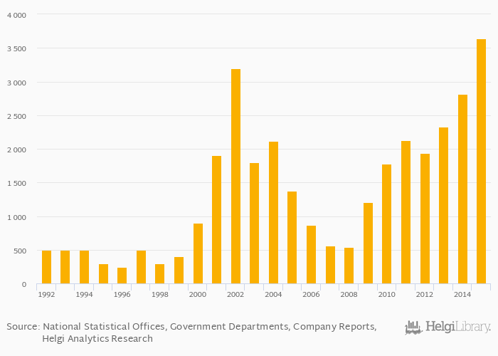 Gold (mine) production rose 29.4% to 3,640 kg in Armenia in 2015, according to the National Statistical Office.