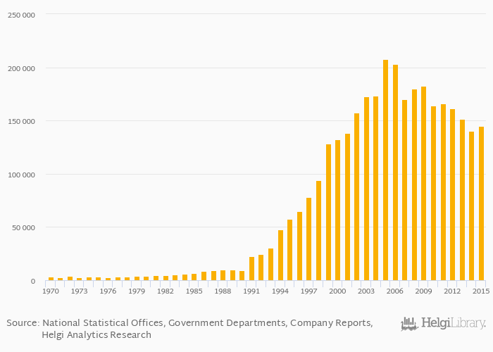 Historically, gold (mine) production in Peru reached an all time high of 207,822 kg in 2005 and an all time low of 2,470 kg in 1976. When compared to Peru's main peers, gold (mine) production in Bolivia amounted to 12,810 kg, 80,000 kg in Brazil, 42,501 kg in Chile and 59,202 kg in Colombia in 2015.