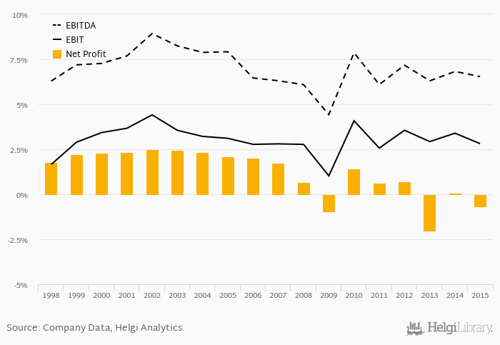 This translates into a net margin of -0.670%. Historically, between 1998 and 2015, the firm’s net margin reached a high of 2.51% in 2002 and a low of -2.03% in 2013. The average net margin in the last five years amounted to -0.257%.