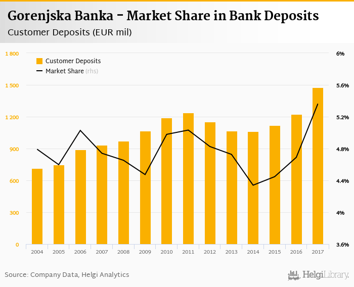 Gorenjska Banka accounted for 5.36% of all customer deposits taken by banks in Slovenia at the end of 2017. Historically, the bank’s market share in customer deposits reached an all time high of 5.36% in 2017 and an all time low of 4.34% in 2014.