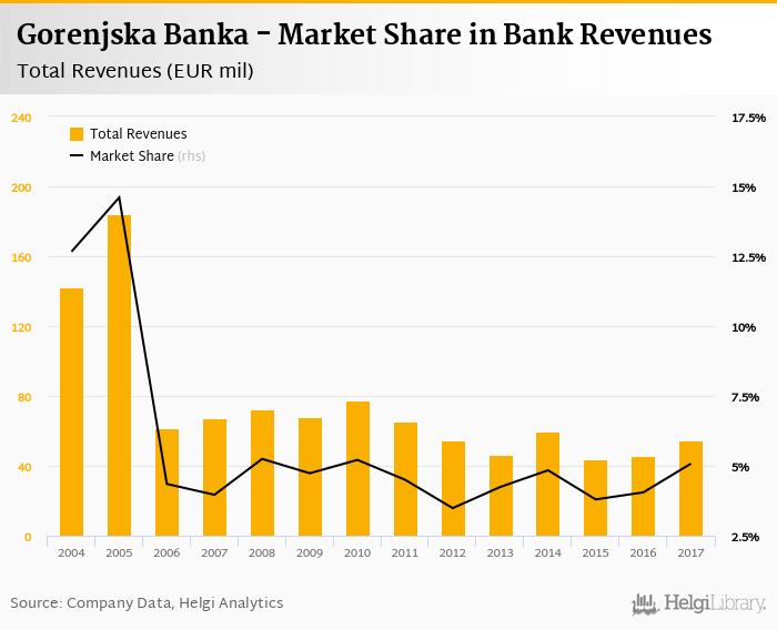 As a result, Gorenjska Banka accounted for 5.08% of all bank revenues generated by banks in Slovenia in 2017. Historically, the bank’s market share in total revenues reached an all time high of 14.6% in 2005 and an all time low of 3.49% in 2012.
