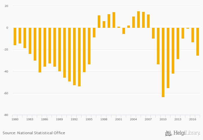 Government budget balance fell 91.0% to -25.5 in Canada in 2017, according to the National Statistical Office.