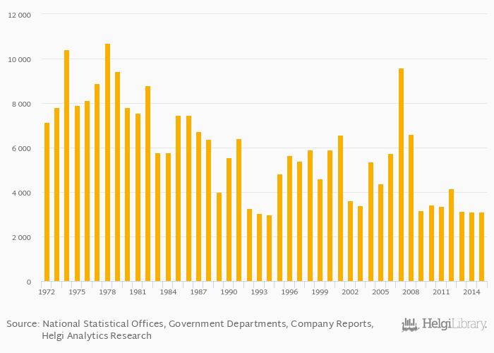 Historically, graphite production in Sri Lanka reached an all time high of 10,708 tonnes in 1978 and an all time low of 2,974 tonnes in 1994.