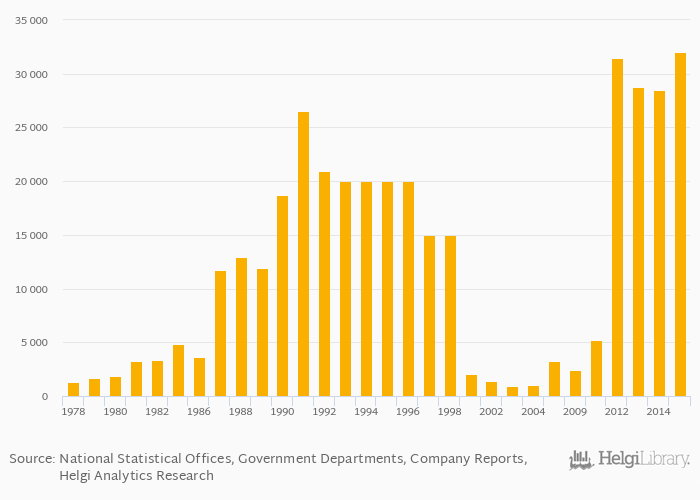Historically, graphite production in Turkey reached an all time high of 32,000 tonnes in 2015 and an all time low of 942 tonnes in 2003.