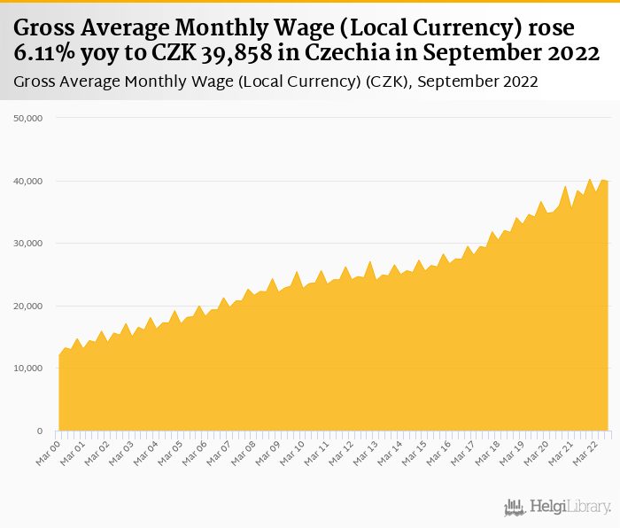 Gross Average Monthly Wage (Local Currency) rose 6.11% yoy to CZK 39,858 in Czechia in September 2022, according to . This is 0% more than in the previous month.