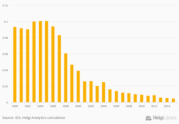 Gross natural gas production as a share of worldwide production fell 8.87% to 0.005% in Ireland in 2015, according to EIA.