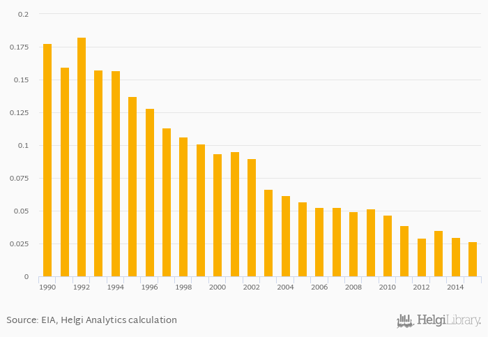 Gross natural gas production as a share of worldwide production fell 11.0% to 0.026% in Chile in 2015, according to EIA.