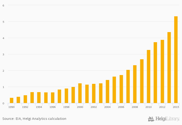 Gross natural gas production as a share of worldwide production rose 0% to 5.34% in Qatar in 2015, according to EIA.