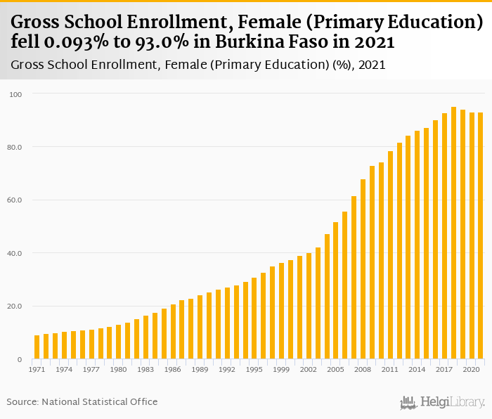Gross school enrollment of females in primary education fell 0.093% to 93.0% in Burkina Faso in 2021, according to World Bank.