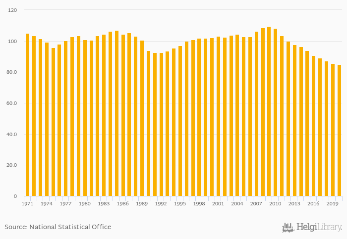 Gross school enrollment of females in primary education fell 0.753% to 85.0% in Bulgaria in 2020, according to World Bank.
