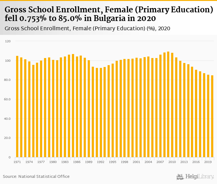 Gross School Enrollment, Female (Primary Education) fell 0.753% to 85.0% in Bulgaria in 2020