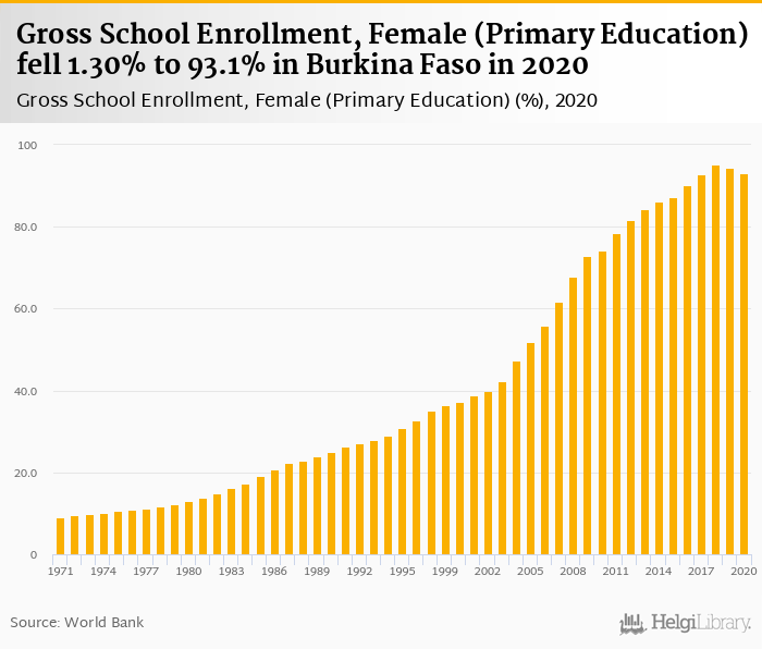 Gross school enrollment of females in primary education fell 1.30% to 93.1% in Burkina Faso in 2020, according to World Bank.