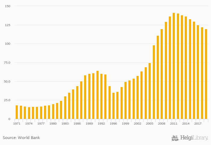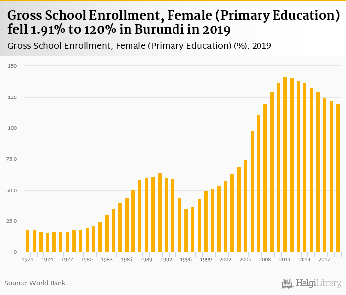 Gross school enrollment of females in primary education fell 1.91% to 120% in Burundi in 2019, according to World Bank.