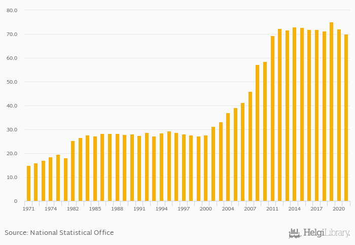 Gross school enrollment of females in primary education fell 3.06% to 70.0% in Djibouti in 2021, according to World Bank.