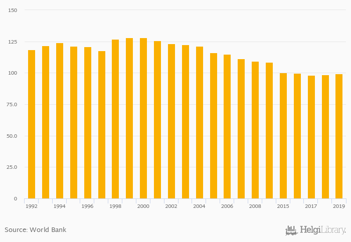 Maldives has been ranked 94th within the group of 124 countries we follow in terms of gross school enrollment of females in primary education, 59 places below the position seen 10 years ago.