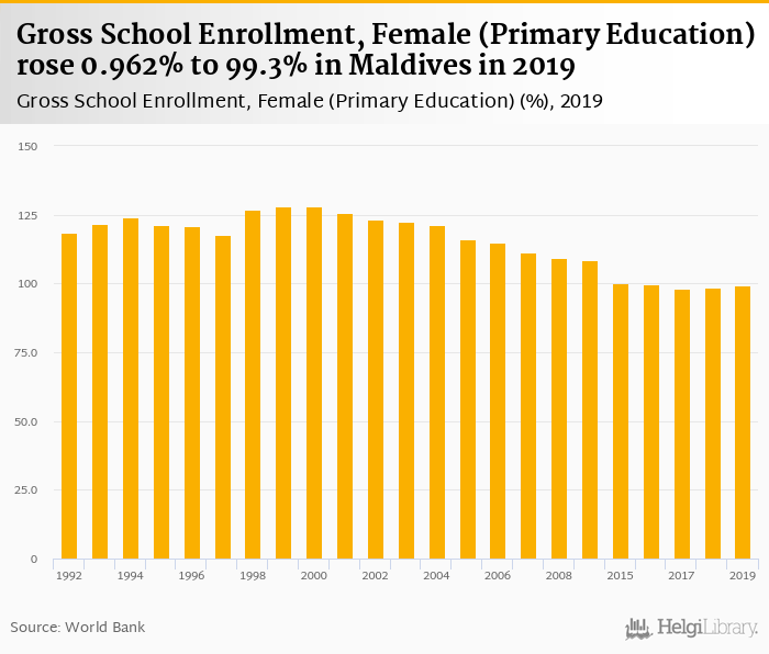 Gross school enrollment of females in primary education rose 0.962% to 99.3% in Maldives in 2019, according to World Bank.