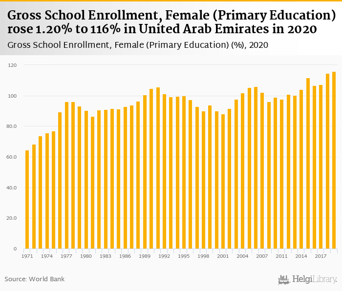 Gross school enrollment of females in primary education rose 1.20% to 116% in United Arab Emirates in 2020, according to World Bank.