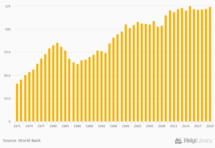 Gross school enrollment of females in primary education rose 1.83% to 124% in Togo in 2020, according to World Bank.
