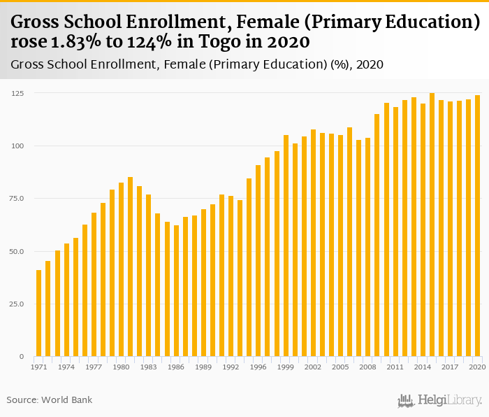 Gross school enrollment of females in primary education rose 1.83% to 124% in Togo in 2020, according to World Bank.