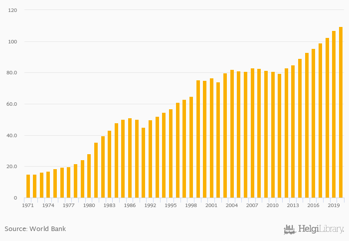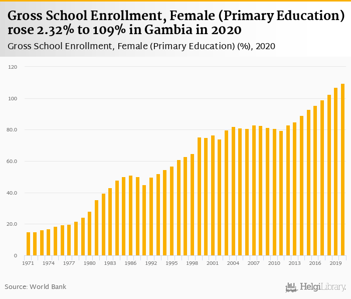 Gross school enrollment of females in primary education rose 2.32% to 109% in Gambia in 2020, according to World Bank.
