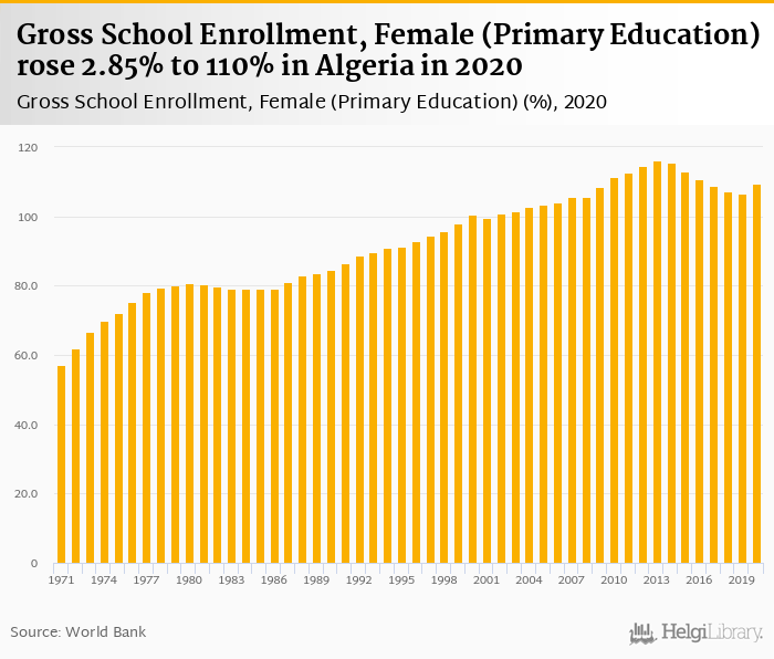 Historically, gross school enrollment of females in primary education in Algeria reached an all time high of 116% in 2013 and an all time low of 57.1% in 1971.