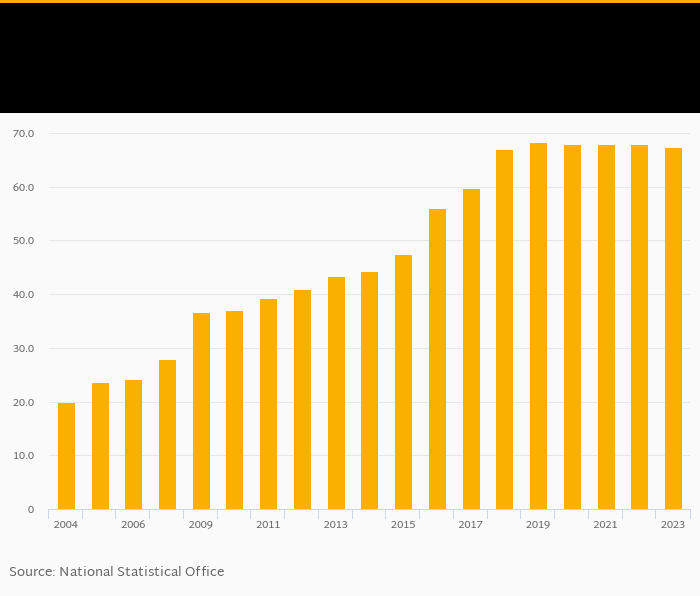 Gross school enrollment of females in tertiary education fell 0.873% to 67.4% in Algeria in 2023, according to World Bank.