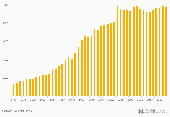 Historically, gross school enrollment of females in tertiary education in New Zealand reached an all time high of 99.1% in 2018 and an all time low of 13.1% in 1970.