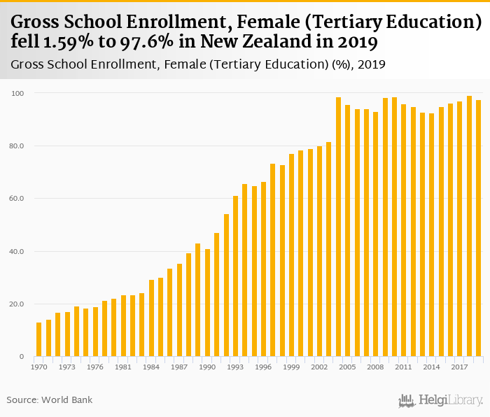Gross school enrollment of females in tertiary education fell 1.59% to 97.6% in New Zealand in 2019, according to World Bank.