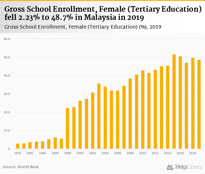 Historically, gross school enrollment of females in tertiary education in Malaysia reached an all time high of 51.7% in 2015 and an all time low of 2.92% in 1979.