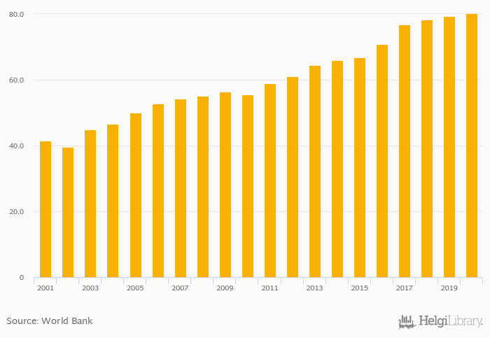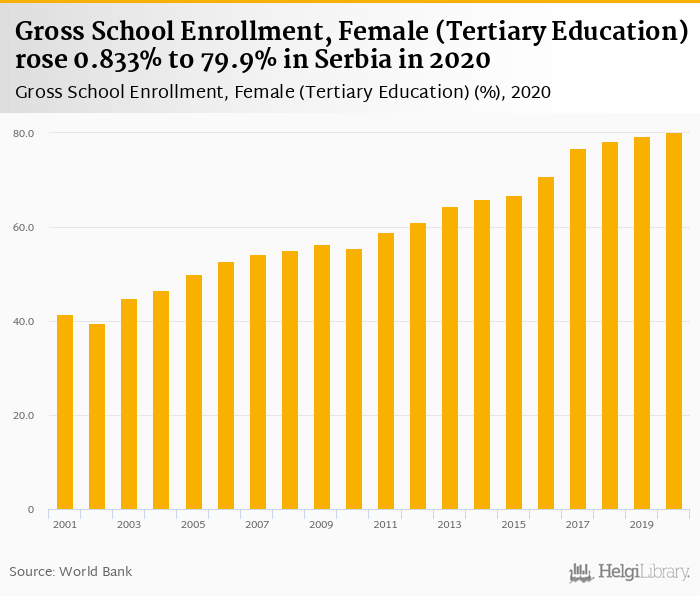 Gross school enrollment of females in tertiary education rose 0.833% to 79.9% in Serbia in 2020, according to World Bank.