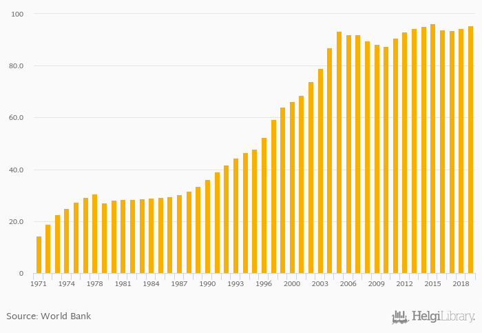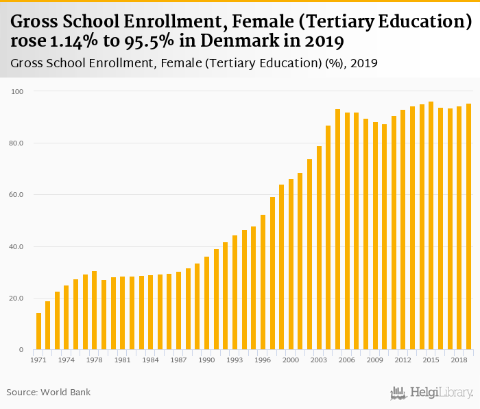 Gross school enrollment of females in tertiary education rose 1.14% to 95.5% in Denmark in 2019, according to World Bank.
