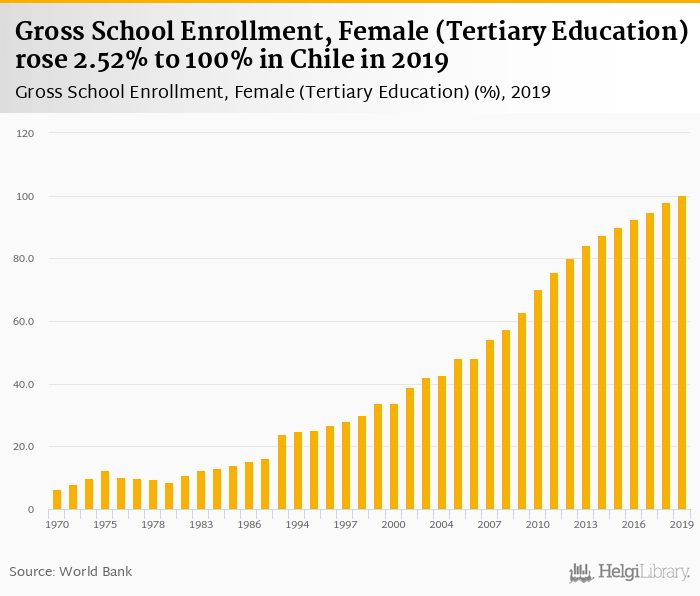 Gross school enrollment of females in tertiary education rose 2.52% to 100% in Chile in 2019, according to World Bank.