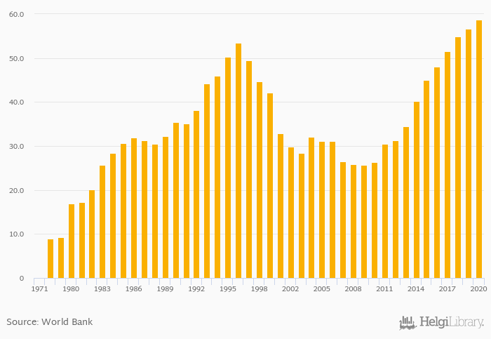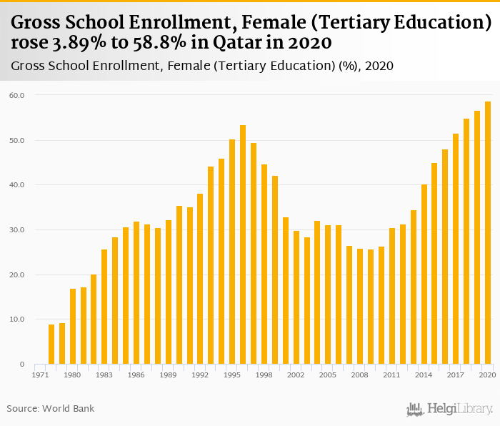 Gross school enrollment of females in tertiary education rose 3.89% to 58.8% in Qatar in 2020, according to World Bank.