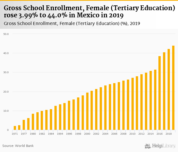 Gross school enrollment of females in tertiary education rose 3.99% to 44.0% in Mexico in 2019, according to World Bank.