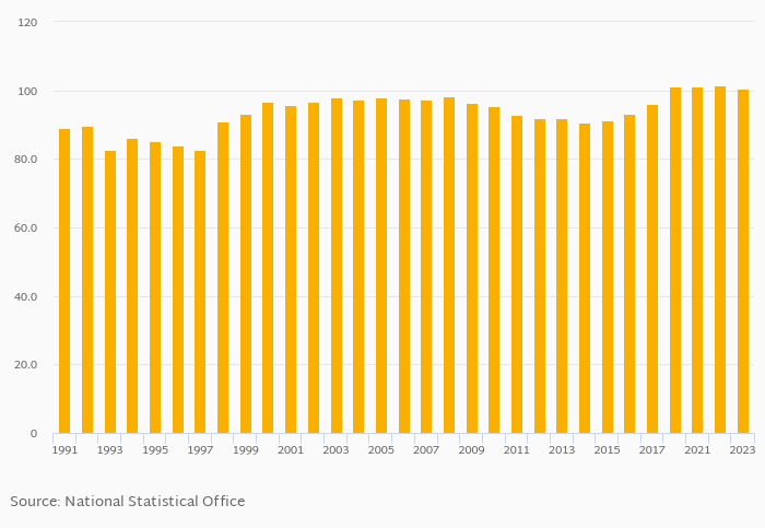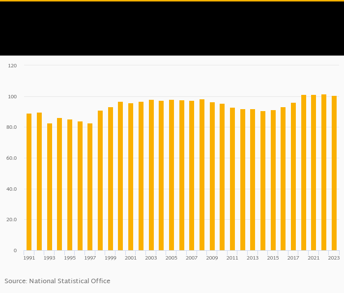 Gross school enrollment in primary education fell 0.716% to 101% in Tajikistan in 2023, according to World Bank.