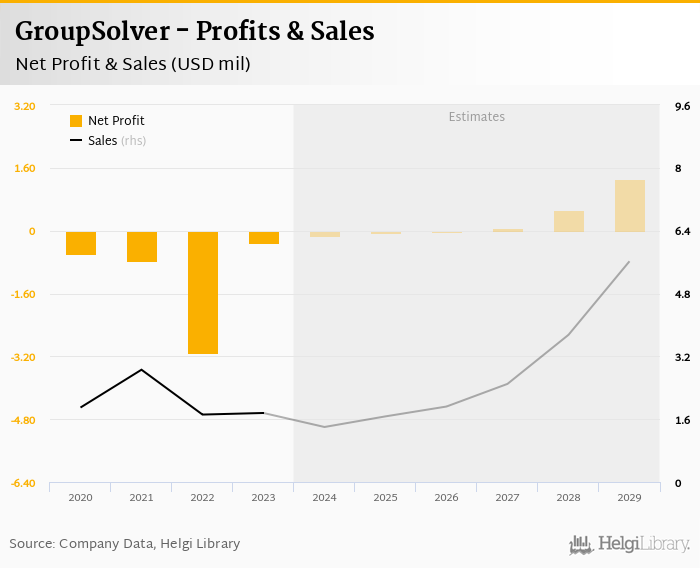 GroupSolver made a net profit of USD -0.305 mil in 2023, up 90.2% compared to the previous year. Total sales reached USD 1.76 mil, which is up 2.34% when compared to the previous year.