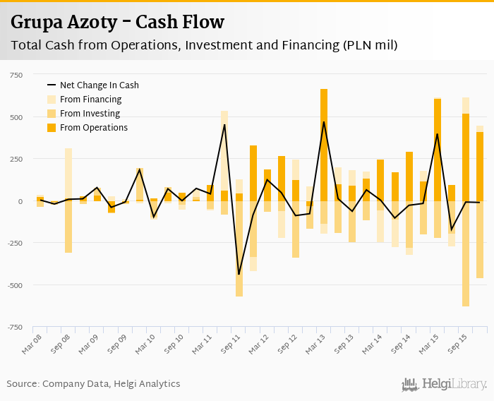Cash from financing amounted to PLN 37.3 mil, so the company generated PLN -13.7 mil net cash in 4Q2015.