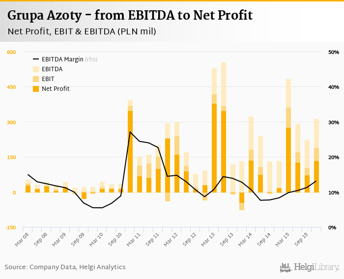 Grupa Azoty made a net profit of PLN 133 mil with revenues of PLN 2,504 mil in 4Q2015, up by 80.9% and up by 4.28%, respectively, compared to the previous year. This translates into a net margin of 6.08%.