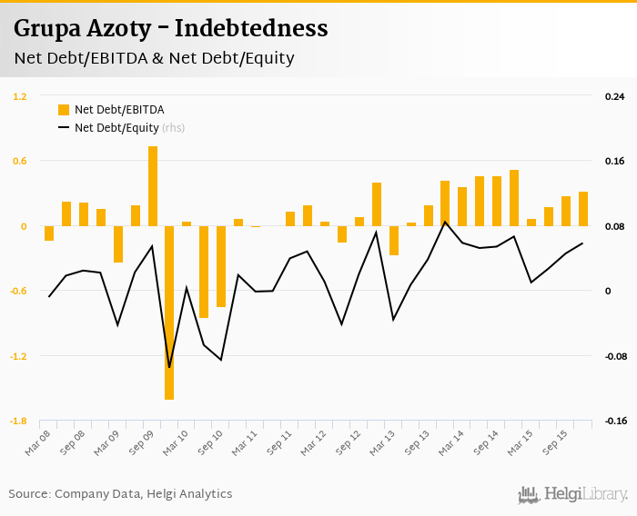 Grupa Azoty's net debt stood at PLN 413 mil and accounted for 0.058 of equity at the end of 4Q2015. The ratio is down 0.008 pp compared to the previous year.