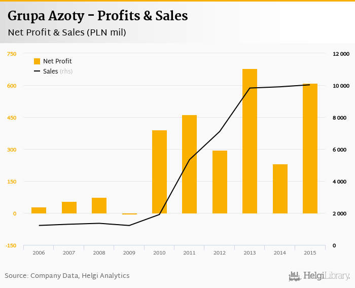 Grupa Azoty made a net profit of PLN 609 mil in 2015, up 163% compared to the previous year. Total sales reached PLN 10,024 mil, which is up 1.27% when compared to the previous year.