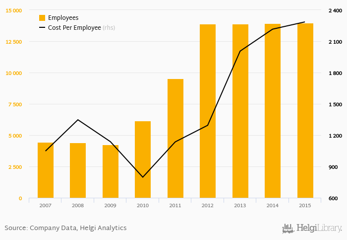 Staff cost represented of sales in 2015, 0 pp higher than a decade ago.
