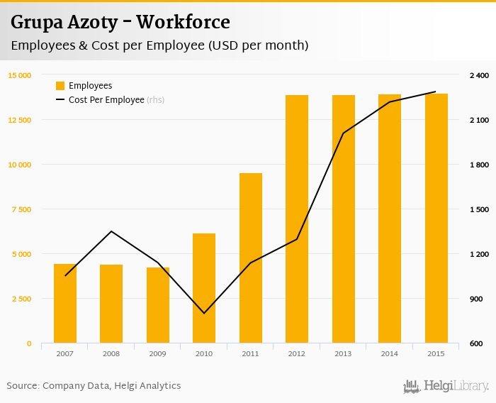 Grupa Azoty employed 13,968 employees in 2015, up 0.208% compared to the previous year. Historically, between 2007 and 2015, the firm's workforce hit a high of 13,968 employees in 2015 and a low of 4,230 employees in 2009.