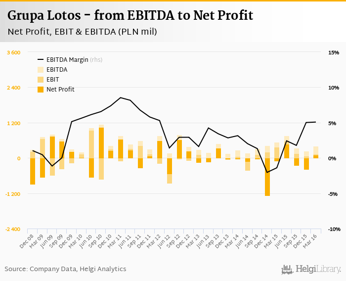 Grupa Lotos made a net profit of PLN 106 mil with revenues of PLN 3,936 mil in 1Q2016, up by 127% and down by 24.7%, respectively, compared to the previous year. This translates into a net margin of -0.260%.