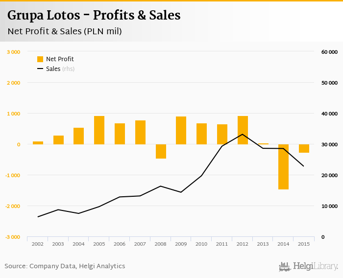 As far as Grupa Lotos's peers are concerned, PKN posted a net profit and sales of PLN 2,837 mil and PLN 88,336 mil in 2015, MOL generated a net profit of HUF -256,554 mil (with sales of HUF 4,102,580 mil), and OMV Petrom netted USD RON -676 mil (sales of RON 18,145 mil).