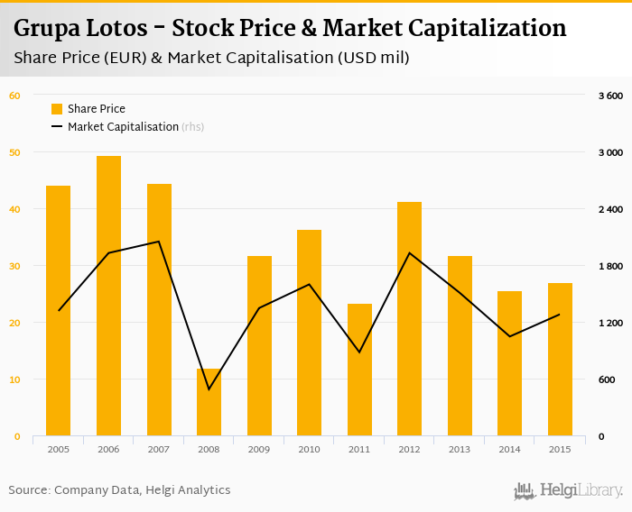 Grupa Lotos stock traded at EUR 27.0 per share at the end 2015 implying a market capitalization of USD 1,280 mil.