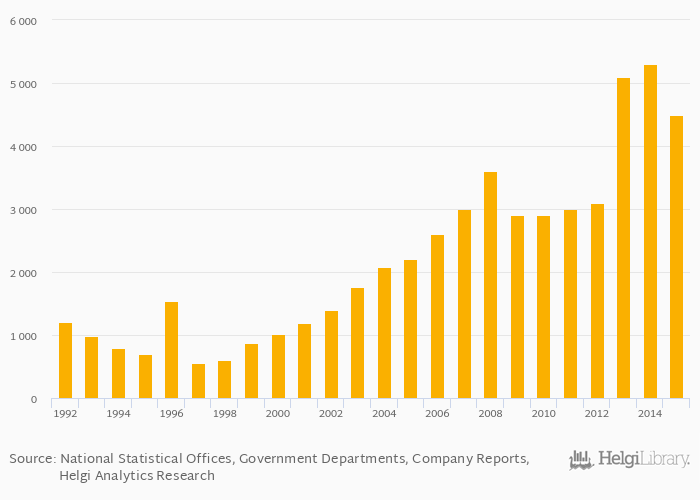 Historically, gypsum and plaster production in Russia reached an all time high of 5,300 kt in 2014 and an all time low of 559 kt in 1997. When compared to Russia's main peers, gypsum and plaster production in China amounted to 132,000 kt, 4,200 kt in Germany, 5,000 kt in Japan and 11,500 kt in USA in 2015.