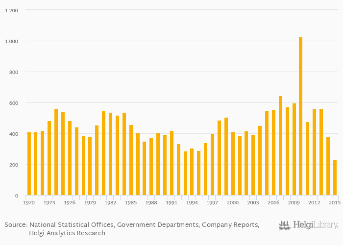 Gypsum and plaster production fell 38.1% to 233 kt in South Africa in 2015, according to the National Statistical Office.