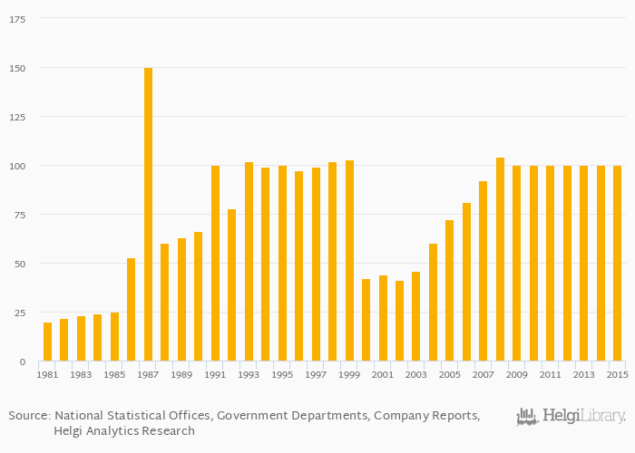 Historically, gypsum and plaster production in Yemen reached an all time high of 150 kt in 1987 and an all time low of 20.0 kt in 1981.